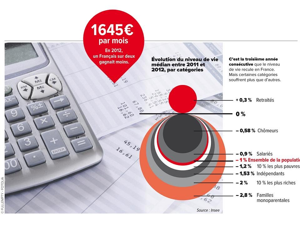 La baisse du niveau de vie médian a une conséquence inattendue : le recul du nombre de personnes considérées comme pauvres. En effet, la pauvreté se définit au niveau européen en dénombrant les personnes percevant moins de 60 % du niveau de vie médian, soit 987 euros par mois en 2012 (997 euros en 2011). Une personne gagnant 990 euros par mois était donc pauvre en 2011 mais ne l’était plus en 2012… Malgré ce recul, 8 540 000 personnes vivent toujours sous le seuil de pauvreté en 2012.