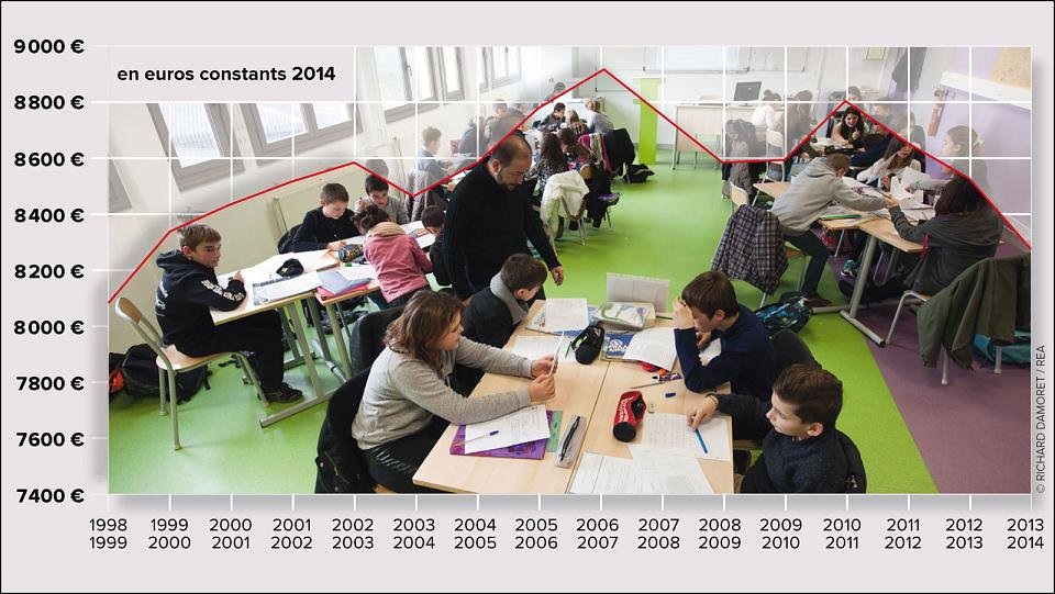 Entre 2005 et 2014, selon le bilan de la rentrée 2014 du ministère, le nombre de collégiens a progressé de plus de 52 700 élèves (+ 2,1 %) quand le nombre de classes a reculé de 1,2 %, soit 1 208 classes en moins. Résultat, le nombre d’élèves par classe au collège est remonté en 2014 à 24,8 alors qu’il était à 24 élèves en 2005.