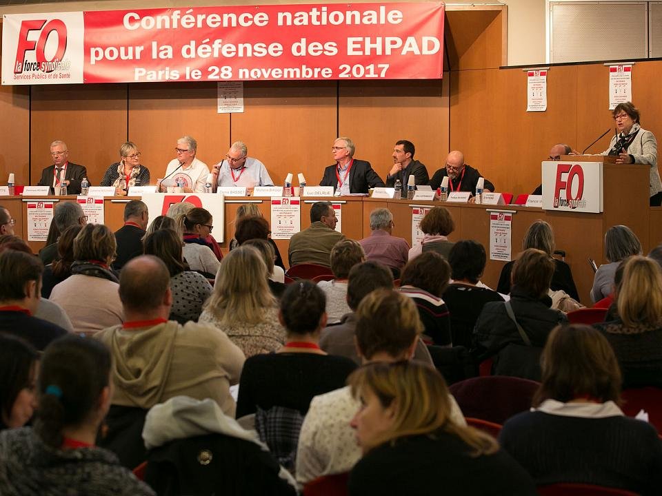 Lors d’une conférence nationale pour la défense des Ehpad, à l’initiative de la Fédération des Services publics et de Santé FO (SPS FO), les 50 délégués qui se sont succédé à la tribune ont témoigné de conditions parfois insoutenables : douches réduites à une par mois, toilettes « VMC (Visage mains cul) ou VC (Visage cul) », repas expédiés en six minutes chrono, personnes alitées faute de personnel pour les lever…