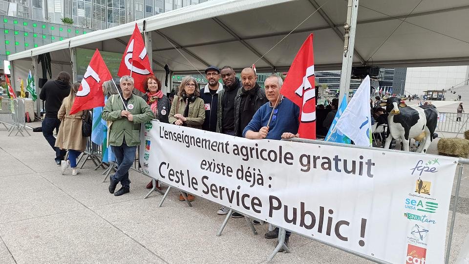 . La banderole a été accrochée le 29 mars sur le parvis de La Défense, devant le CNIT et à l’entrée d’un chapiteau accueillant pour l’après-midi un forum citoyen sur le thème de l’enseignement agricole et de l’agriculture de demain. La manifestation était organisée par un large collectif rassemblant des organisations syndicales parmi lesquelles FO, une fédération de parents d’élèves et des organisations citoyennes. L’objectif était notamment de défendre l’avenir de l’enseignement public agricole face à la privatisation grandissante du secteur.