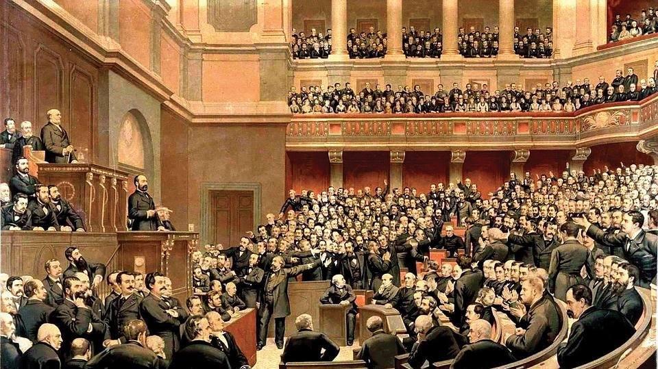 T out commence à Noël 1874 au sein de la Chambre des députés de la toute jeune et fragile IIIe République, née en pleine guerre avec l’Allemagne et qui connaîtra à ses débuts la sanglante Commune de Paris. Dans l’hémicycle, trois courants s’affrontent : les républicains, les monarchistes et les bonapartistes. Les premiers sont majoritairement à la droite de cette tendance. Les socialistes y sont encore minoritaires. Les seconds sont divisés en deux entre une aile ultra ― rêvant de revenir avant 1789 ― et une autre prônant une monarchie constitutionnelle comme celle de Louis-Philippe entre 1830 et 1848. Quant aux troisièmes, il s’agit du reliquat des fidèles de Napoléon III, battu en 1870 à Sedan.