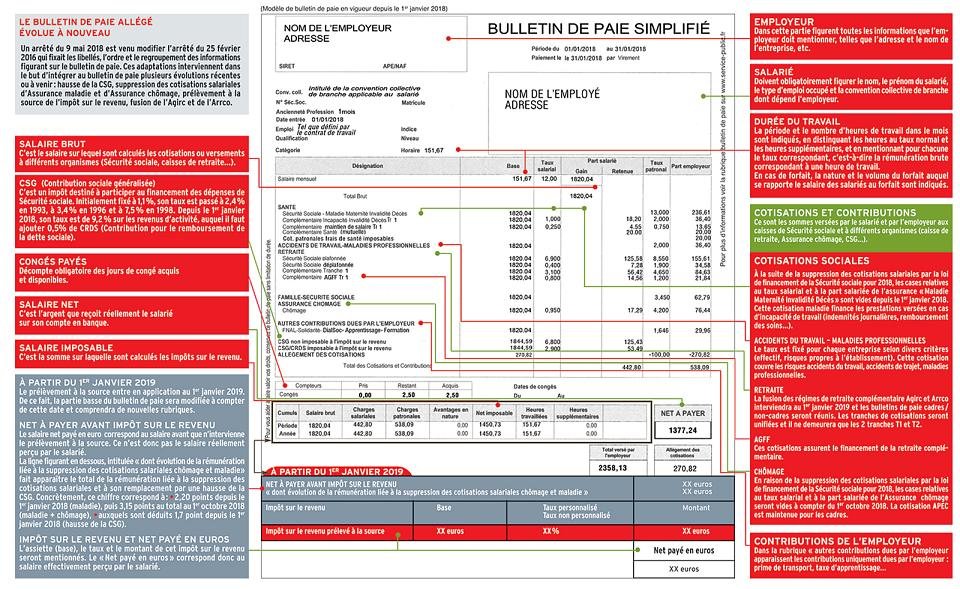 Un arrêté du 9 mai 2018 est venu modifier l’arrêté du 25 février 2016 qui fixait les libellés, l’ordre et le regroupement des informations figurant sur le bulletin de paie. Ces adaptations interviennent dans le but d’intégrer au bulletin de paie plusieurs évolutions récentes ou à venir : hausse de la CSG, suppression des cotisations salariales d’Assurance maladie et d’Assurance chômage, prélèvement à la source de l’impôt sur le revenu, fusion de l’Agirc et de l’Arrco.