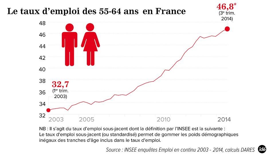 Conséquence logique des réformes successives qui ont relevé les critères de départ en retraite, en France, depuis 2003, le taux d’emploi des 55-64 ans est passé de moins de 33 % à 46,5 % début 2014 et l’âge moyen de départ à la retraite est passé de 60,5 ans en 2009 à 61,5 ans fin 2014.