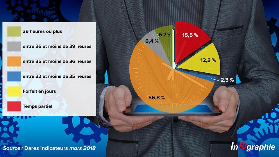 Et 12,3 % des salariés (14,5 % des salariés à temps complet) sont au forfait jours, avec un décompte du temps de travail non pas en heures hebdomadaires mais en jours travaillés. C’est le secteur des activités financières et d’assurances qui y a le plus recours (33,7 %).