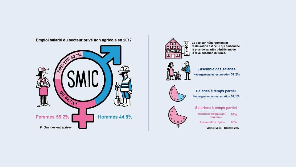 C’est dans « l’hôtellerie, restauration et tourisme » que la proportion de travailleurs payés au Smic de janvier 2017 a été la plus importante avec 31 % pour l’ensemble des salariés et 54 % pour ceux à temps partiel. Avec un taux qui grimpe à 65 % dans la convention collective de branche de la « restauration rapide ». Dans les TPE du secteur de l’« hébergement et restauration », 44,5 % des salariés ont directement bénéficié de la revalorisation du Smic au 1er janvier 2017, contre 24,3 % des salariés dans les entreprises de même taille tous secteurs confondus.